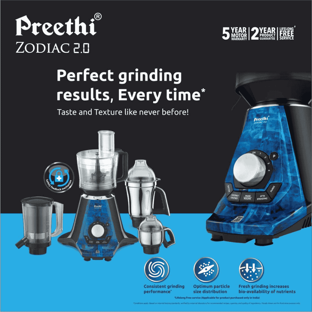 Thanks to its robust motor and solid construction, the Preethi Zodiac 2.0 model is built for long-term use. Many users report consistent performance even after years of daily operation.